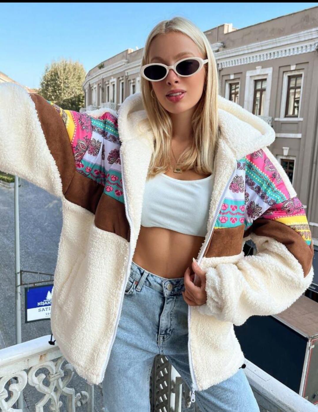 Jachetă casual din blană artificială cu glugă și imprimeu digital pe piept, disponibilă în trei mărimi: S, M, L