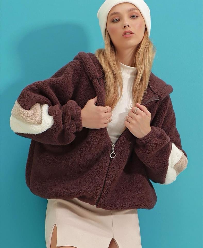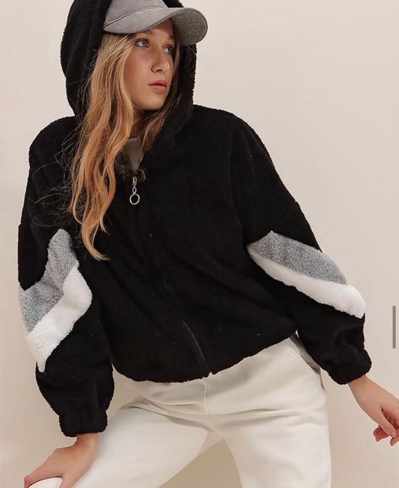 Jachetă casual din blană artificială cu glugă și imprimeu digital pe piept, disponibilă în trei mărimi: S, M, L